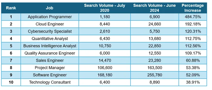 Interest in application programmer roles grew the most. Data from July 2020 showed an average of 1,180 searches per month for the job. That rose 484.75% to 6,900 per month by June 2024.